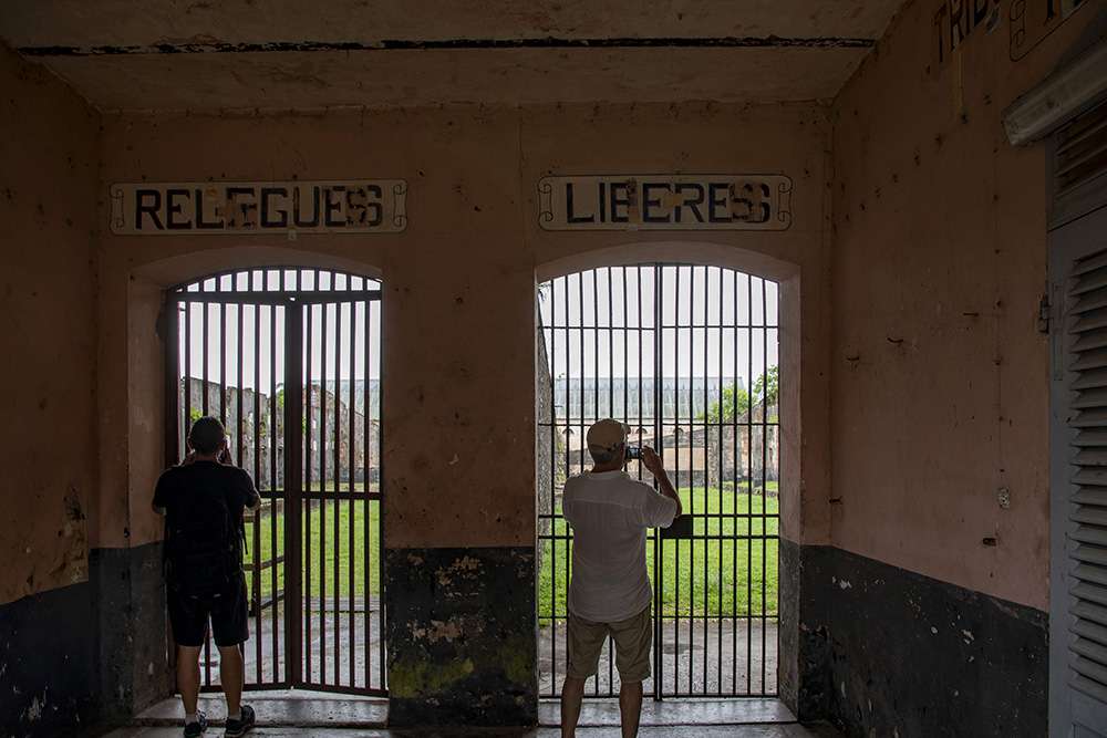 Nous avons toujours cru que les fantômes étaient blancs et translucides. C’est faux. Notre visite du Camp de la Transportation de Saint-Laurent-du-Maroni nous a appris qu’ils étaient multicolores. Dans cette “antichambre de l’enfer” que nous avons arpentée pendant plusieurs heures, les spectres des anciens bagnards, brièvement croisés au détour des cellules et des dortoirs rongés par le temps, portaient des vareuses de mauvais coton, jaunâtres et aux rayures rouges, des chapeaux de paille de pandanus ou des pyjamas et bonnets bleus. Leurs vêtements indiquaient les différents statuts que leur avait attribués l’administration pénitentiaire coloniale : criminels transportés, politiques déportés, récidivistes relégués et condamnés libérés mais contraints de rester en Guyane (voir encadré ci-dessous). Et on devinait que ceux dont les rayures rouges avaient viré au marron avaient passé de longues années dans l’enfermement inhumain de la colonie française transformée en pénitencier.