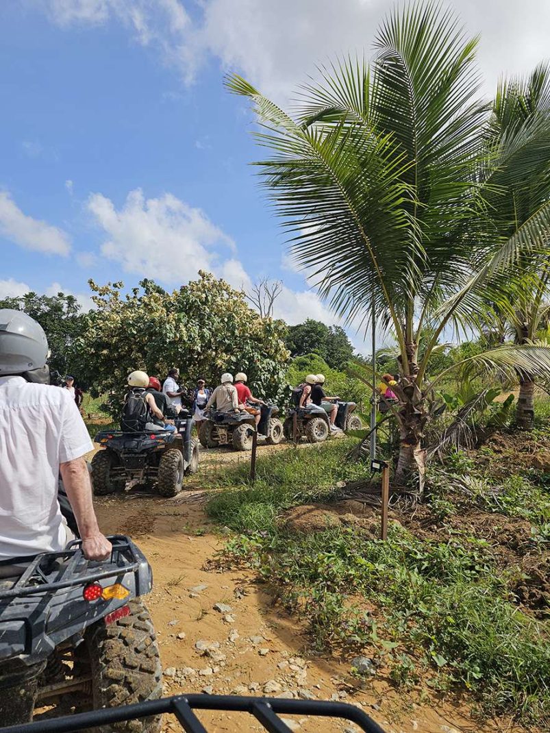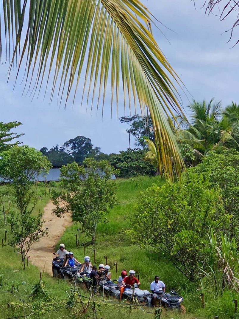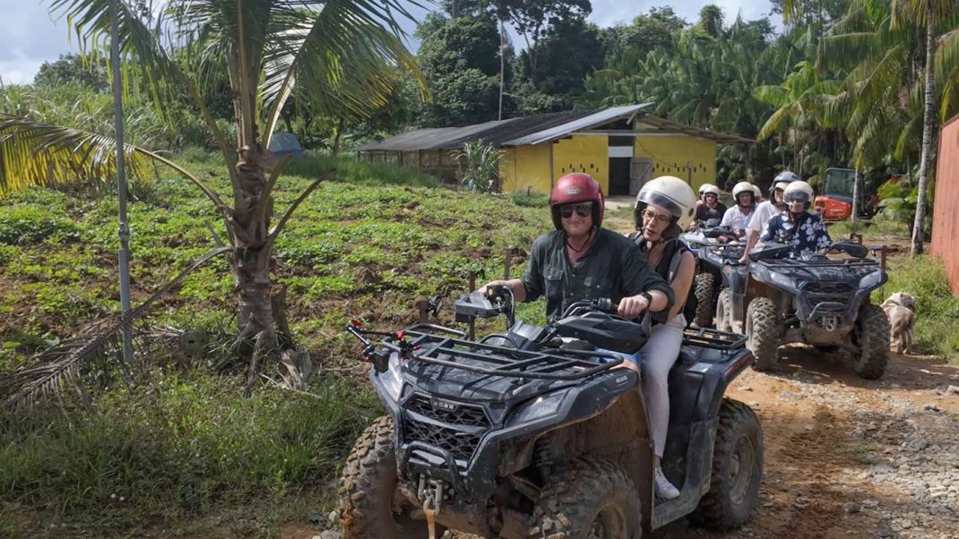 Chaleureusement accueillis par l’ensemble du personnel de la ferme et par Antoine Zulemro et Johan Pardonipade, deux jeunes chefs cuisiniers représentants des « Toques guyanaises ». Un petit café pour les uns, un premier ti-punch pour les autres et le groupe se scinde en deux. Le premier part à la découverte du site, embarqué sur des Quads, et pour le second, la visite de la ferme se fait dans un premier temps à pied, avant d’échanger pour une balade motorisée.