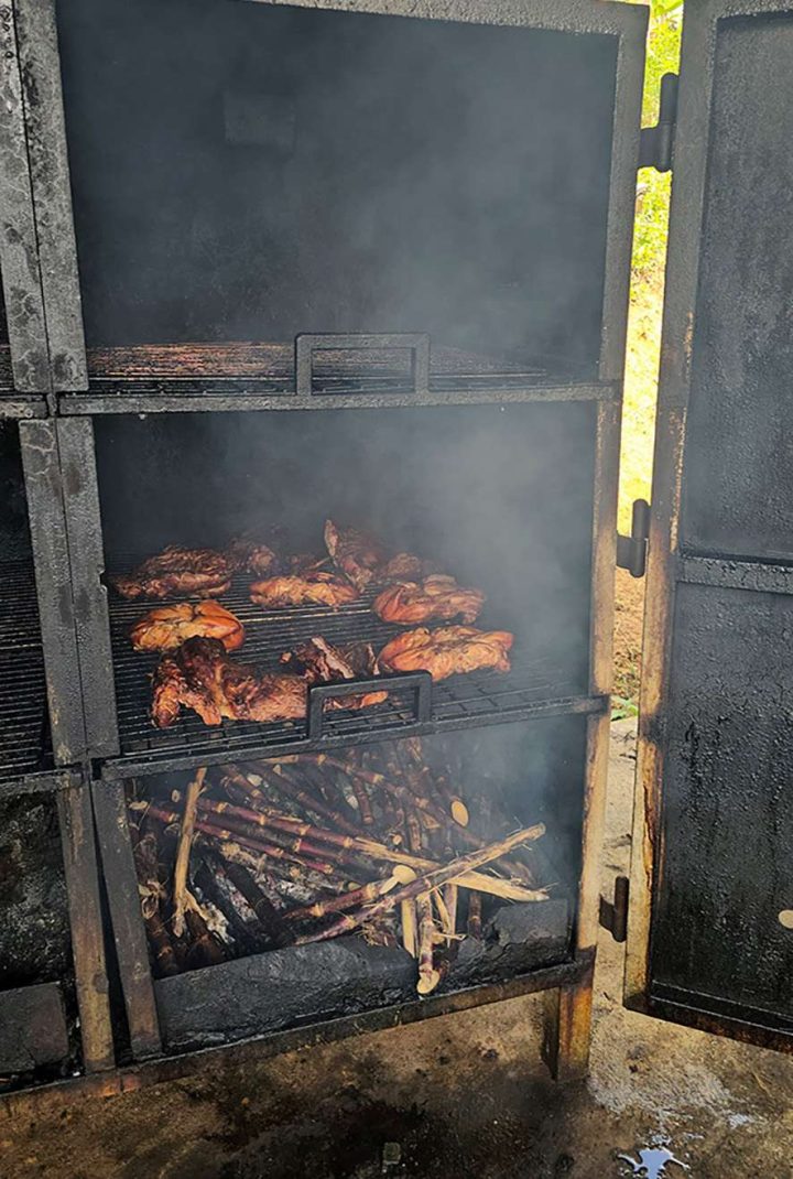 Le boucané, signature des tables guyanaises : dans l’armoire à fumer, viandes et volailles cuisent lentement au-dessus des braises de canne à sucre, avant d’être sorties, dorées et fumantes, pour le déjeuner à la Ferme François. ©Brice Charton