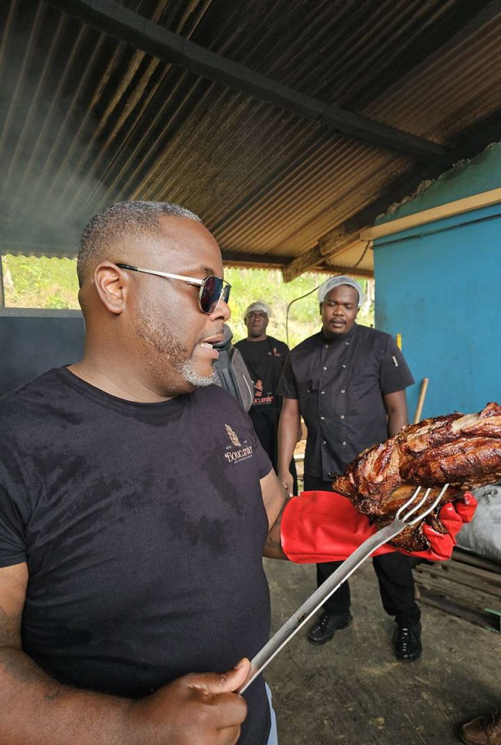 Il n’est que 10 heures mais la chaleur sous le soleil tropical est déjà accablante. L’endroit est vaste ; après quelques explications nous découvrons les différentes plantations, guidé par le maître des lieux, M. François. Ce dernier nous invite à la récolte, alors vaillants sous ce soleil de plomb, nous retroussons nos manches et cueillons gaiement haricots verts géants, patates douces, dachines, fruits et graines de palmiers, tout le nécessaire pour nous sustenter au déjeuner. Clou du spectacle, l’arrêt devant l’armoire à boucaner. À l’intérieur, épaule d’agneau, poulets entiers et magrets de canard mijotent à feu doux au-dessus des braises de cannes à sucre. La chaleur est à son comble !