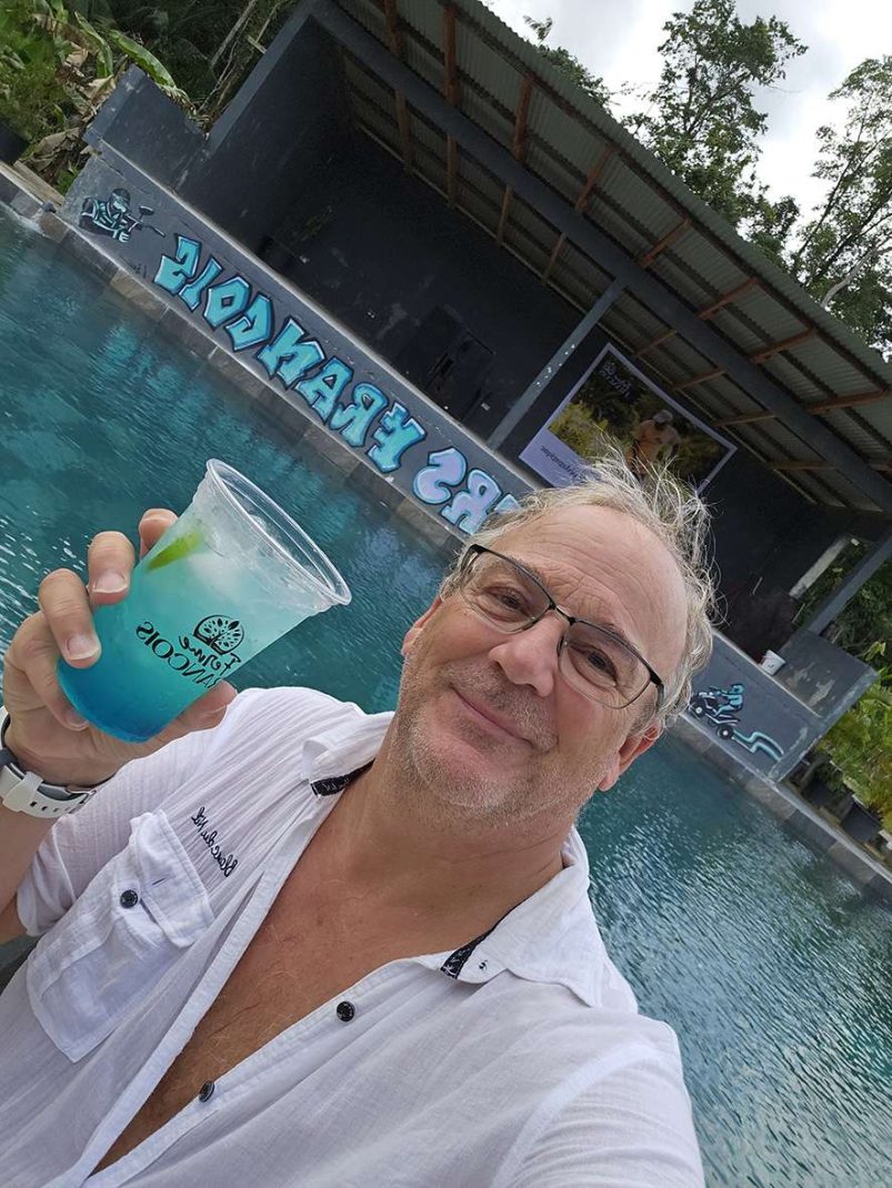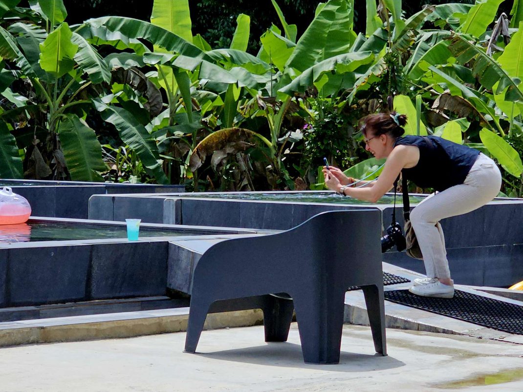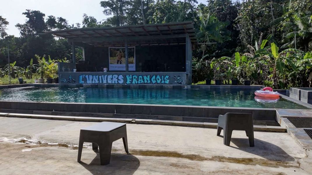 Après ce rappel bien utile, au bout d’un chemin un peu chaotique – comprenez en terre et non en bitume – nous arrivons à la Ferme François. À première vue, le site ressemble plus à un lieu de fêtes qu’à une exploitation agricole. Dès la descente du bus, nous apercevons, non sans une grande joie, une immense piscine – le rêve quand il fait 35° à l’ombre avec près de 100 % d’humidité. À sa gauche, un immense hangar où se dresse une longue, très longue table, et au fond un bar. Au centre, dos à la piscine, un cœur géant, érigé là pour permettre de réaliser des selfies très « love is in the air ».