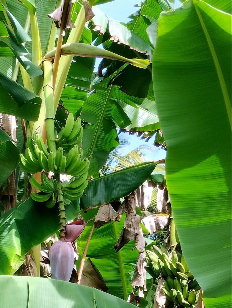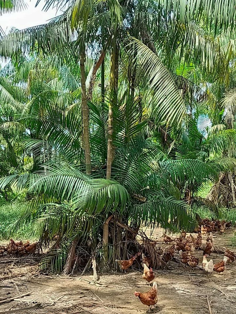 Bananier et basse-cour sous les palmes : ici la gastronomie commence dans les cultures et l’élevage, avant de finir à table. ©Benoît Gueuning